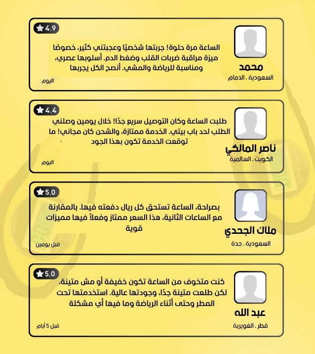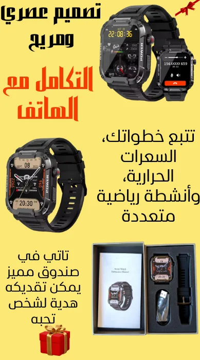 لأنها تجمع بين الأناقة والتكنولوجيا الحديثة! ساعة ذكية بتصميم عصري، تراقب صحتك بدقة من خلال متابعة ضربات القلب وضغط الدم، بالإضافة إلى أنها مقاومة للماء. والأفضل من ذلك؟ التوصيل مجاني والدفع عند الاستلام!